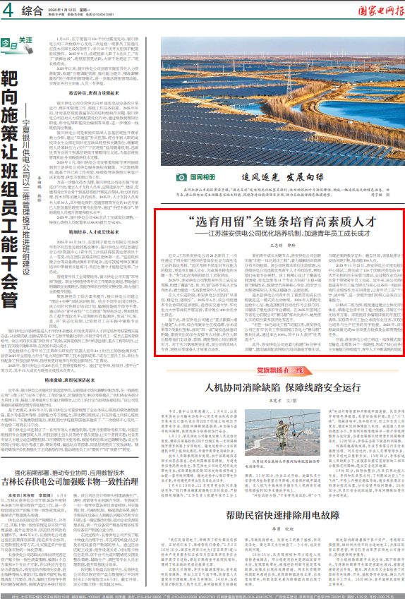 “选育用留”全链条培育高素质人才 ——江苏淮安供电公司优化培养机制、加速青年员工成长成才 近日,江苏淮安供电公司28名新员工一次性通过了相关部门组织的登高作业证与高压电工证的取证考核。“这次考核不仅是对专业能力的检验,更是我们融入企业、完成角色转变的关键一步。”参与此次考核的新员工余俊贤说。 2025年,淮安供电公司聚焦青年员工成长全周期,构建了覆盖“选、育、用、留”各环节的人才培养体系,着力锻造一支高素质青年人才队伍。 在人才引进阶段,淮安供电公司坚持“早谋划、精定位、强吸引”。2025年6月,该公司组建多专业协同的宣讲团队,赴西安交通大学、华北电力大学等高校开展宣讲,累计吸引400余名学生报名。 基于此,淮安供电公司建立“重点跟踪+潜力储备”人才库,综合考察学生在校成绩、学术成果等7项量化指标,面向“双一流”高校选拔意向明确、素质突出的学生安排专人对接,并在入职后推荐他们至设备、营销、调度等核心岗位跟班实习。对于实习期表现突出者,该公司将其纳入专责、班组长等储备人才库重点培养。 紧扣青年成长关键节点,淮安供电公司创新实施“市县一体化培优工程”,着力破解培训资源分布不均瓶颈。该公司统筹本单位优质资源,从县级供电公司选拔优秀青年人才共同培养,帮助他们拓宽专业视野。该工程精心设计了覆盖电网调度、变电运维等11个专业方向的“主修+辅修”课程体系,鼓励学员深耕核心专业,同步学习关联领域知识,实现主辅融合、全面发展。 涟水县供电公司青年员工董奕君的成长历程就是这一模式的生动体现。2024年入职配电运检中心后,她选择配网自动化作为主修方向,并辅修了继电保护专业课程。在2025年国网江苏省电力有限公司“赛马制”练兵比武中,她凭借扎实的综合素养获评优秀选手。 “市县一体化培优工程”实施以来,淮安供电公司已有77名员工参加国网江苏电力“赛马制”练兵比武,通过率达100%,其中11人获评“优秀选手”。 此外,淮安供电公司还着力构建“30分钟实训圈”,建设城南配农网综合培训基地开展实训,与理论案例教学互补。截至目前,该基地累计开设培训班7期,培训超350人次。 2025年11月23日,淮安供电公司变电检修中心修试二班完成了110千伏顺河变电站10千伏开关柜的自主安装与调试,全过程作业均由技术骨干带领青年员工完成。近年来,该公司持续推进青年员工能力转化与核心业务向一线回归,将作业现场作为实训课堂,让青年员工在“干中学、战中练”,进一步提升他们的核心业务自主实施能力。 以修试二班为例,班组通过建立立体化评价体系,精准定位青年员工能力短板,并制订个性化培养方案。该班组同步编制详细的年度任务清单,安排青年员工独立承担作业任务,实现能力培养与生产任务的有序衔接。2025年,该班组高质量完成60余项重点检修及全部常规检修任务。 目前,淮安供电公司已将这一培养模式推广至输电、电缆等14个一线班组,形成了核心业务自主实施能力持续提升、青年人才不断涌现的局面。(王志辉 郭玲)