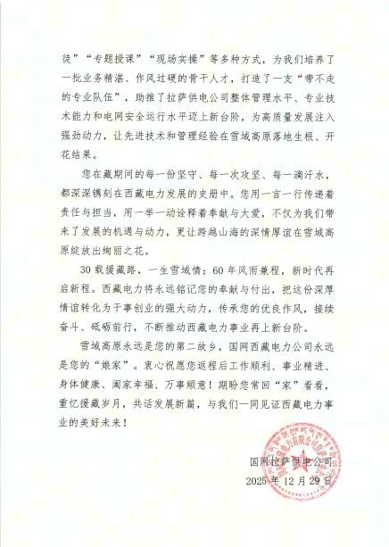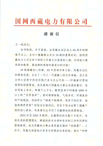 2026年,是国家对口支援西藏工作走过30年的重要节点。1月8日,在西藏拉萨公司基建工程一线,公司援藏青年骨干王一帆正专注投入到220千伏东城变电站的建设中。谈起不久前收到的感谢信,他感慨道:“这份肯定让我备受鼓舞。新的一年,我将继续聚焦藏区电网安全可靠运行,扎实做好技术优化、隐患排查和服务保障,用实际行动为高原电力事业发展尽一份力。” 王一帆的心声,是公司一批又一批援藏人员的共同写照。近日,公司陆续收到来自国网西藏电力有限公司的九封感谢信,信中高度赞誉连云港电力人“缺氧不缺精神、艰苦不怕吃苦、海拔高境界更高”的崇高信念。 自援藏工作启动以来,公司坚决贯彻落实网省公司关于援藏工作的部署要求,始终坚持“输血”与“造血”并重、“支援”与“共建”同行,聚焦人才、技术、传承三个领域,持续为西藏电力事业高质量发展注入“连电力量”。 选优派强,打造高原上的“连电先锋” 援藏工作的高质量开展,离不开坚实的人才支撑。2007年以来,公司累计选派9名青年骨干赴藏开展对口支援,他们奔赴拉萨、林芝等地区,在高寒缺氧、条件艰苦的环境中,参与配农网改造、运维检修、电力营销等多个关键专业领域,用实际行动践行“人民电业为人民”的企业宗旨。 公司一直高度重视人才培养工作,把挂职帮扶作为人才开拓眼界、增强管理思维的重要载体,致力于构建选育管用的全链条人才培养模式。近年来,公司创新提出“多维多库”人才储备培养机制,打造员工全职业生涯成长培养体系,搭建全阶段、全岗位、全专业员工成长路径,建设全业务核心标杆班组,源源不断地为包括援藏在内的各项重点任务提供坚强人才保障。 破解难题,输送高原电网“连电技术” 电力援藏,技术是核心。公司援藏人员充分发挥在智能电网、配网自动化等领域的技术积淀,牵头组建西藏首支地市级配网不停电作业小组,相继完成西藏中部地区首次10千伏线路带电搭接任务、高原地区首次不停电复杂作业,推动西藏配网不停电作业“从无到有”。针对配网现状及存在的问题,公司援藏人员积极组织相关专业全面梳理辖区所有网格,逐一制定网格提升方案和规划项目,为未来五年的配网规划夯实基础。编发《配电网技术导则》《配电自动化管理规范》等多项管理制度,进一步夯实西藏公司配电网管理水平。 电力援藏,理念是关键。在对藏培训协作中,公司多次为西藏公司电力技术人员开展配电自动化、配电不停电复杂作业专题培训,组织开展营业厅及相关业务人员培训,通过宣贯解读优化营商环境等相关文件及法律法规,进一步提高业扩报装业务人员的专业水平和合规管理意识,实现“留下一支带不走的队伍”。 精神传承,厚植“志气连云”企业品格 援藏不仅是人才与技术的输出,更是精神交融。公司通过搭建“学思践悟”大讲堂、“看见”、劳模工匠宣讲等多元化学习交流平台,全面推行师带徒“三定”培养机制,邀请援藏归来人员分享高原故事、传承援藏精神,激励广大青年员工扎根基层、服务大局。 公司将援藏帮扶、挂职借用作为干部人才淬炼的“练兵场”,优先选派政治素质高、业务能力强、有奉献精神的优秀骨干参与攻坚克难工作,并在评优评先、岗位晋升等方面予以倾斜,形成“组织搭台、人才唱戏、事业共进”的良性循环。 站在援藏30周年的新起点,公司将继续以高度的政治自觉和深厚的民族情怀,深化人才援藏、技术援藏、文化援藏,为推动西藏电力事业现代化、促进民族团结进步贡献更多“连电智慧”与“连电力量”。