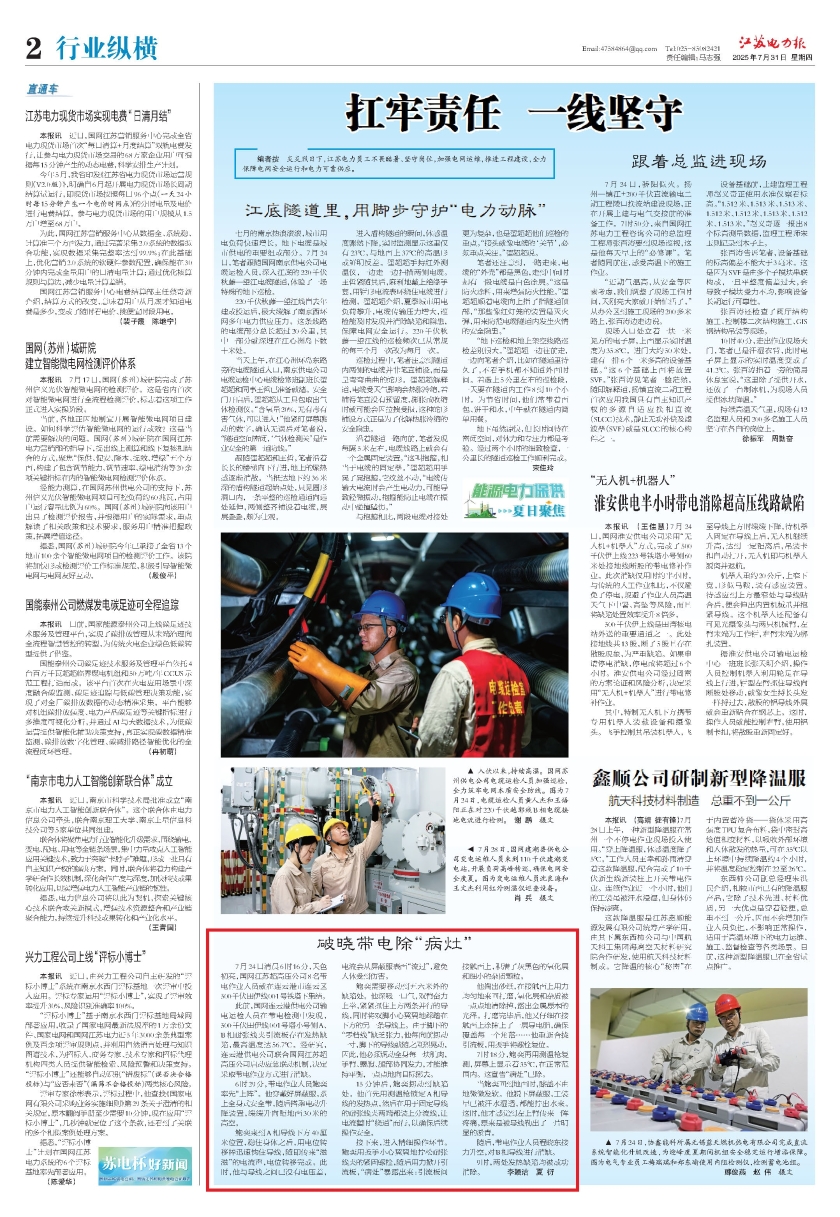 7月24日清晨6时16分,天色初亮,国网江苏超高压公司8名带电作业人员就在连云港市连云区500千伏田伊线001号铁塔下集结。 此前,国网连云港供电公司输电运检人员在带电检测中发现,500千伏田伊线001号塔小号侧A、B相耐张线夹引流板存在发热缺陷,最高温度达56.7℃。经研究,连云港供电公司联合国网江苏超高压公司启动应急联动机制,决定采取带电作业方式进行消缺。 6时29分,带电作业人员鲍奕率先“上阵”。他穿戴好屏蔽服,系上全身式安全带,随后搭乘电动升降装置,缓缓升向距地面30米的高空。 鲍奕来到A相导线下方40厘米位置,稳住身体之后,用电位转移棒迅速钩住导线,随即传来“滋滋”的电流声,电位转移完成。此时,他与导线之间已没有电压差,电流会从屏蔽服表面“流过”,避免人体受到伤害。 鲍奕需要移动到五六米外的缺陷处。他深吸一口气,双臂奋力上举,紧紧抓住上方两条并行的导线,同时将双脚小心翼翼地踩踏在下方的另一条导线上。由于脚下的“零档线”缺乏张力,他每向前挪动一寸,脚下的导线就随之剧烈晃动,因此,他必须调动全身每一块肌肉,手臂、腰腹、腿部协同发力,才能维持平衡,一点点地向目标挪去。 15分钟后,鲍奕挪动到缺陷处。他首先用测温枪锁定A相导线的发热点,然后在用于固定导线的耐张线夹两端都装上分流线,让电流暂时“绕道”而行,以确保后续操作安全。 接下来,进入精细操作环节。鲍奕用扳手小心翼翼地拧松耐张线夹的紧固螺栓,随后用力掀开引流板,“病灶”暴露出来:引流板间接触面上,积满了灰黑色的氧化层和细小的杂质颗粒。 他掏出砂纸,在接触面上用力均匀地来回打磨,氧化层和杂质被一点点地清除掉,露出金属原本的光泽。打磨完毕后,他又仔细在接触面上涂抹上了一层导电脂,确保覆盖每一个角落……他重新合拢引流板,用扳手将螺栓复位。 7时18分,鲍奕再用测温枪复测,屏幕上显示着35℃,在正常范围内。这宣告“病灶”已除。 当鲍奕回到地面时,膝盖不由地微微发软。他脱下屏蔽服,工装早已被汗水湿透,都能拧出水来。这时,他才感觉到左上臂传来一阵疼痛,原来是被导线勒出了一片明显的淤青。 随后,带电作业人员程晓东接力升空,对B相导线进行消缺。 9时,两处发热缺陷均被成功消除。