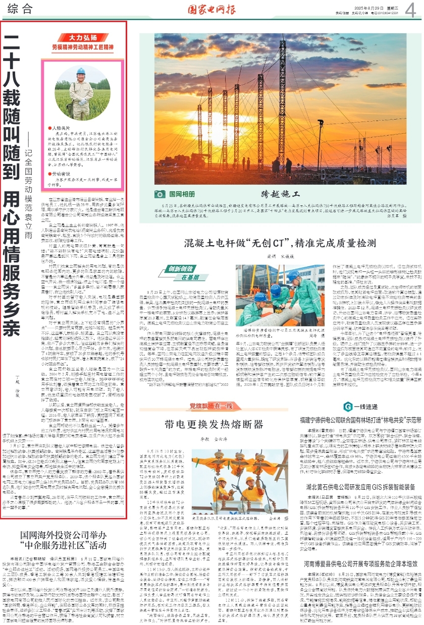 ●人物名片 袁立雨,中共党员,江苏连云港三新供电服务有限公司灌云分公司南岗业务所运维采集工。他扎根农村供电服务一线28年,主动帮助村民解决各类用电问题,曾获得“全国优秀农民工”“中国好人”以及江苏省劳动模范、江苏省五一劳动奖章、江苏好人等荣誉。 ●劳动者说 为客户服务不是一天的事,而是一辈子的事。 在江苏省连云港市灌云县南岗镇,有这样一名供电员工,他扎根一线28年,用脚步丈量乡间阡陌,用双手守护万家灯火。他是连云港三新供电服务有限公司灌云分公司南岗业务所运维采集工袁立雨。 袁立雨是土生土长的南岗镇人。1997年,他入职灌云县南岗农电站(现南岗业务所),先后负责南岗镇南于、赵庄、袁姚3个行政村的线路运维、电费回收、故障抢修等工作。 村里人的用电需求很朴素,常常就是一句话:“能不能赶快有电?”只要电话响起,无论酷暑严寒还是刮风下雨,袁立雨总是拿上工具包就往外跑。 村民们找袁立雨解决的用电问题,有的是供电服务范围内的,更多的则是家里的内部故障。不管是分内事还是分外事,他总是及时处理。合上空气开关,换一根保险丝,拧上个电灯泡,安一个插座……袁立雨说:“乡里乡亲的,总不能看着人家黑着灯,我让他找别人吧。” 对于村里的留守老人来说,电视是最重要的陪伴,袁立雨还利用业余时间学会了维修电视的技能。随着智能手机普及,他又成了手机维修员,帮村里人解决手机充不了电、连不上网等问题。 对于袁立雨来说,上下班没有明显的“分界点”——只要村民有需要,他随叫随到。越是天气不好,这些事儿就越多、越紧迫。袁立雨从来没有推辞过,经常刚端起碗筷又放下。他说自己学历不高,做不了多少大事儿,但这些能为乡亲们解决的小问题,自己就要尽心尽力干好。多年来,他骑坏了4辆自行车,穿破了20多双绝缘鞋,他的手机号也被村民们写在了挂历、墙上甚至药盒上,成了“24小时服务热线”。 袁立雨和钱玉兰老人结缘是因为一次巡线。2004年2月,刚接手赵庄村用电管理工作的袁立雨在村口被一位老人拦住。她咿咿呀呀地用手比划着,还拽着袁立雨的工作服往前走。袁立雨意识到,老人可能有用电问题。到了老人家,他发现屋顶的电线被老鼠咬断了,便帮她修好了线路。 从那以后,袁立雨便开始帮扶钱玉兰老人。老人每接受一次帮助,就在自家门板上用粉笔画一道。2016年,老人家里盖了新房,便把画满了感谢的门板送给了袁立雨,上面有407道画痕。 袁立雨帮助的不仅是钱玉兰一人。凭借多年的工作积累,他对供区内村民的用电情况和用电习惯了如指掌:养鸡场的葛大爷每月要打印电费清单,五保户朱大姐不会用手机线上交费…… 7月17日,袁立雨来到张义碧老人家中帮忙修理电扇。这位老人曾参加过解放战争、抗美援朝战争。南岗镇是革命老区,这里曾生活着24位参加过抗日战争、解放战争和抗美援朝战争的老兵。袁立雨为他们建立了专属档案。如今,这24位老兵仅剩张义碧一人,但袁立雨仍和同事定期上门走访,排查用电安全隐患,帮他解决生活中的难题。 这些年,袁立雨把个人的力量变成了群体的力量:2003年,灌云县供电公司成立了袁立雨共产党员服务队。2019年,这个服务队更名为国家电网江苏电力(灌云开山岛)共产党员服务队。目前,党员服务队共有108名队员,他们结合村民用电需求及时解决用电问题,全心全意提供优质供电服务。 从青春年少到两鬓微霜,28年间,在平凡而琐碎的工作中,袁立雨以赤子之心温暖了很多需要帮助的人。他说:“为客户服务不是一天的事,而是一辈子的事。”