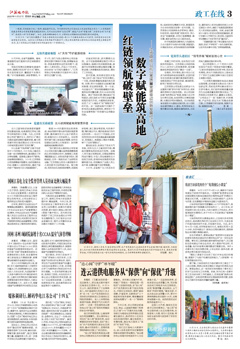 赵奶奶是一名空巢老人,家住连云港市海州区海连社区园林小区。11月20日上午,她的家里来了三位特殊客人,他们是国网江苏电力(连云港“连心电”)共产党员服务队队员陈家玄和姚秋辰以及海连社区网格员周德叶。来人义务帮助检查室内线路、清理空气开关柜内杂物……这是一项由国网连云港供电公司“连心网”服务机制触发的安全守护服务。 连日的持续低温,让港城用电负荷显著攀升。连云港供电公司依托“连心网”服务机制,启动寒潮保供电专项服务,组织“连心电”共产党员服务队联合社区网格员,重点对独居老人、困难家庭等特殊群体开展上门走访活动。 “连心网”服务机制是连云港供电公司推进社区共治共建的重要载体。该机制以党建为引领,构建了“网格长—网格经理—网格员”三级服务网络,由“连心电”共产党员服务队骨干担任网格长,对接社区党组织,围绕“基础保障、价值延伸、社群联动”三个维度制定服务清单,精准覆盖居民用电刚需与“一老一小”等特殊群体。 今年以来,该公司联动街道社区、物业、公益组织等部门和单位,打造“1+N”共建共治生态圈,目前已与海连社区和幸福社区签署共建协议,推进老旧小区低压台区改造的同时,建立独居老人专属档案,推动电力服务从“保供”向“保优”升级。 “我们正打造电力大数据平台,录入信息后即可实时掌握特殊群体家庭的用电情况。”连云港供电公司海州供电服务中心主任高悬介绍,“一旦监测到异常,系统将自动生成预警工单,同步推送给电力网格员与社区网格员,实现‘数据预警、政企联动、上门服务’的闭环管理。”截至目前,平台共发出安全预警42次,累计开展特殊群体走访服务326次,处理用电隐患89处。赵奶奶家的这次服务就是其中之一。 全国人大代表、海连社区党委书记李肖娜表示,“连心网”将专业服务嵌入社区治理末梢,在独居老人关爱、老旧小区改造、用电安全宣传等方面发挥了实实在在的作用。
