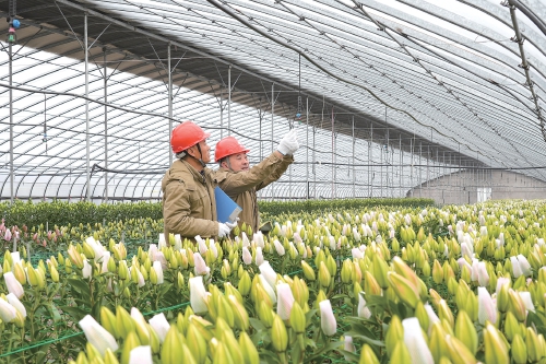 眼下,在江苏省连云港市东海县双店镇鲜切花种植基地内,2.3万亩鲜切花正值生长关键期,即将迎来销售旺季。为保障低温天气鲜花生产,国网连云港供电公司升级“连心电”品牌服务,对基地大棚的控温、照明、灌溉等用电设备进行全面检修,护航鲜切花如期上市。图为国网连云港供电公司工作人员在基地检查用电设备。