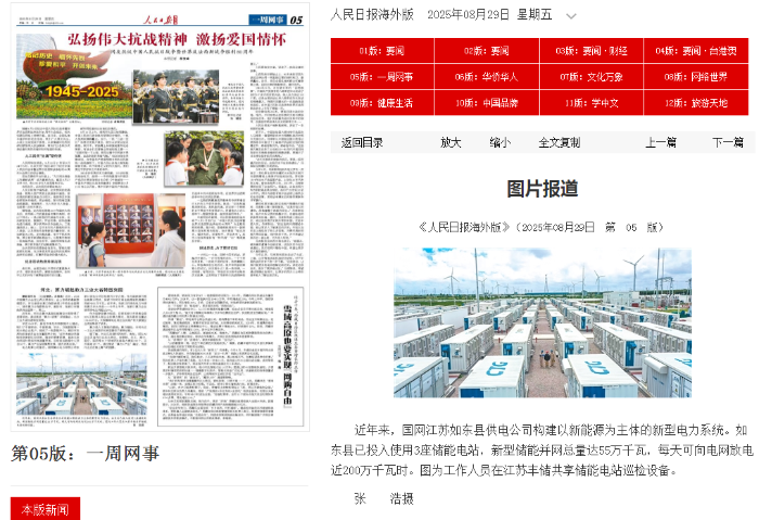 8月29日,人民日报海外版5版刊发如东公司图片新闻。报道指出,近年来,国网江苏如东县供电公司构建以新能源为主体的新型电力系统。如东县已投入使用3座储能电站,新型储能并网总量达55万千瓦,每天可向电网放电近200万千瓦时。