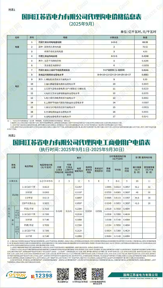 国网江苏省电力有限公司关于2025年9月代理购电工商业用户电价的公告