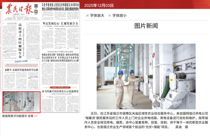 12月3日,农民日报头版刊发“电暖乡村,护航用能”图片新闻。报道指出,近日,在江苏省宿迁市宿豫区关庙区域性农业综合服务中心,来自国网宿迁供电公司“电暖流”便民服务站的工作人员上门对企业供电线路、用电设备进行巡检和维护,指导操作人员安全规范用电。