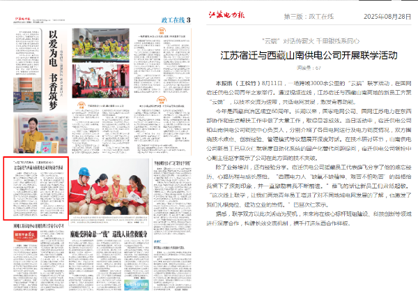 8月11日,一场跨域3000余公里的“云端”联学活动,在国网宿迁供电公司青年之家举行。通过视频连线,江苏宿迁与西藏山南两地的新员工齐聚“云端”,以技术交流为纽带,共话电网发展,激发青春动能。 今年是西藏自治区成立60周年。长期以来,国家电网公司、国网江苏电力在东西部协作和定点帮扶工作中做了大量工作,取得显著成效。当日活动中,宿迁供电公司和山南供电公司调控中心负责人,分别介绍了各自电网运行及电力调度情况,双方围绕技术难点、创新经验、管理模式等议题展开深度对话。在技术研讨环节,山南供电公司新员工巴旦次仁就调度自动化系统的国产化替代问题提问,宿迁供电公司调控中心副主任赵宇展示了公司在此方面的技术突破。 除了业务培训,还有经验分享。宿迁供电公司援藏员工代表薛飞分享了他的难忘经历、心路历程与成长感悟。“西藏电力人‘缺氧不缺精神、艰苦不怕吃苦’的品格给我留下了深刻印象,并一直激励着我不断前进。”薛飞的话让新员工们肃然起敬。“这次线上联学,让我们两地青年员工增进了对不同地域电网发展的了解,也激发了我们扎根岗位、建功立业的热情。”巴旦次仁表示。 据悉,联学双方以此次活动为契机,未来将在核心标杆班组建设、科技创新等领域进行深度合作,构建长效交流机制,携手打造东西合作样板。