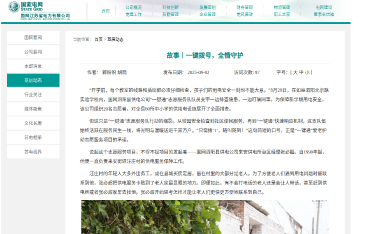“开学前,每个教室的线路和插座都必须仔细检查,孩子们的用电安全一刻也不能大意。”8月29日,在如皋泗阳北京路实验学校内,国网泗阳县供电公司“一键通”志愿服务队队员支宇一边排查隐患,一边叮嘱同事。为保障新学期用电安全,该公司组织20名志愿者,对全县80所中小学的供用电设施展开了全面排查。 但这只是“一键通”志愿服务队行动的缩影。从校园安全检查到社区便民服务,再到“一键通”快速响应机制,这支队伍始终活跃在服务民生一线,将光明与温暖送进千家万户。“只需拨‘1’,随叫随到!”这句简短的口号,正是“一键通”爱老护幼志愿服务项目的承诺。 说起这个志愿服务项目,不得不提项目的发起者——国网泗阳县供电公司来安供电所台区经理张必超。自1990年起,他便一直负责来安街道汪庄村的供电服务保障工作。 汪庄村的年轻人大多外出务工,或在县城买房定居,留在村里的大部分是老人。为了方便老人们遇到用电问题时能联系到他,张必超把供电服务卡贴到了老人家最显眼的地方。即便如此,有不会打电话的老人还是会让人带话,甚至赶到供电所或者张必超家里去找他。张必超开始思考怎样才能让老人们更快更方便地联系到自己。 张必超发现,老人们习惯用的老年机有一键拨号功能,便试着将老人手机上的“1”号键设置成快捷键。老人有什么急事,能第一时间通过一键拨号联系到他。从2016年5月为第一位老人设置快捷键开始,到2016年年底,张必超为汪庄村72户老人都设置了快捷键。 渐渐地,老人们不仅在家里灯不亮的时候打电话联系张必超,遇到其他大事小情也会第一时间找他帮忙。有的老人请他帮忙买米面油,有的老人因为家里三轮车轮胎没气了,打电话请他送打气筒。无论啥事,只要接到老人的电话,张必超总是随叫随到。有时候夜里接到求助电话,他和妻子打着手电筒骑着三轮车去老人家里解决问题。 汪庄村81岁的独居老人陈玉莲左眼失明,老伴去世。她唯一的女儿远嫁,不能经常回家照顾她。陈玉莲说,十几年来,张必超帮了自己很多:“家里的地是他找人刨的,麦子也是他帮我种的。我眼睛疼,打电话联系他,外面下着雨,他还带我去看病,药钱也是他付的。” 2021年,张必超服务汪庄村老人的事得到了媒体的关注。《人民日报》、新华社等媒体报道了他的事迹,相关新闻全网累计阅读量突破1.5亿次。同年10月,宿迁供电公司党委正式发起“一键通”爱老护幼志愿服务项目。各供电所台区经理挨家挨户走访村民,为4300余名农村留守老人设置了一键拨号。 近年来,依托“一键通”爱老护幼志愿服务项目,供电志愿者累计提供“业务办理送上门、安全检查送到家、日夜守候送安心、节能降耗送实惠、义务检查送温暖”的“五送”特色服务3000余次,紧急救助突发疾病老人8名。他们还开设“一键通”银发课堂,编写并发放了2000余册《送给爷爷奶奶的手机使用指南》;为困难家庭、孤寡老人免费安装太阳能灯具;搭建“一键通”文艺送理舞台,用老年人爱听爱唱的地方戏剧宣讲政策理论和用电知识;排查孤寡老人等特殊群体用电安全情况,逐户建立“一户一档”备案表,确保精准响应他们的需求。 2023年,“一键通”爱老护幼志愿服务项目被江苏省志愿服务工作协调小组等评为江苏省优秀志愿服务项目,被中共江苏省委宣传部等评为第七届江苏志愿服务展示交流会金奖项目;2024年,被江苏省青年志愿者协会评为江苏省优秀青年志愿服务项目。2025年,该项目入选全国志愿服务“四个100”先进典型名单,获评最佳志愿服务项目。 稿件来源:省公司网站基层动态