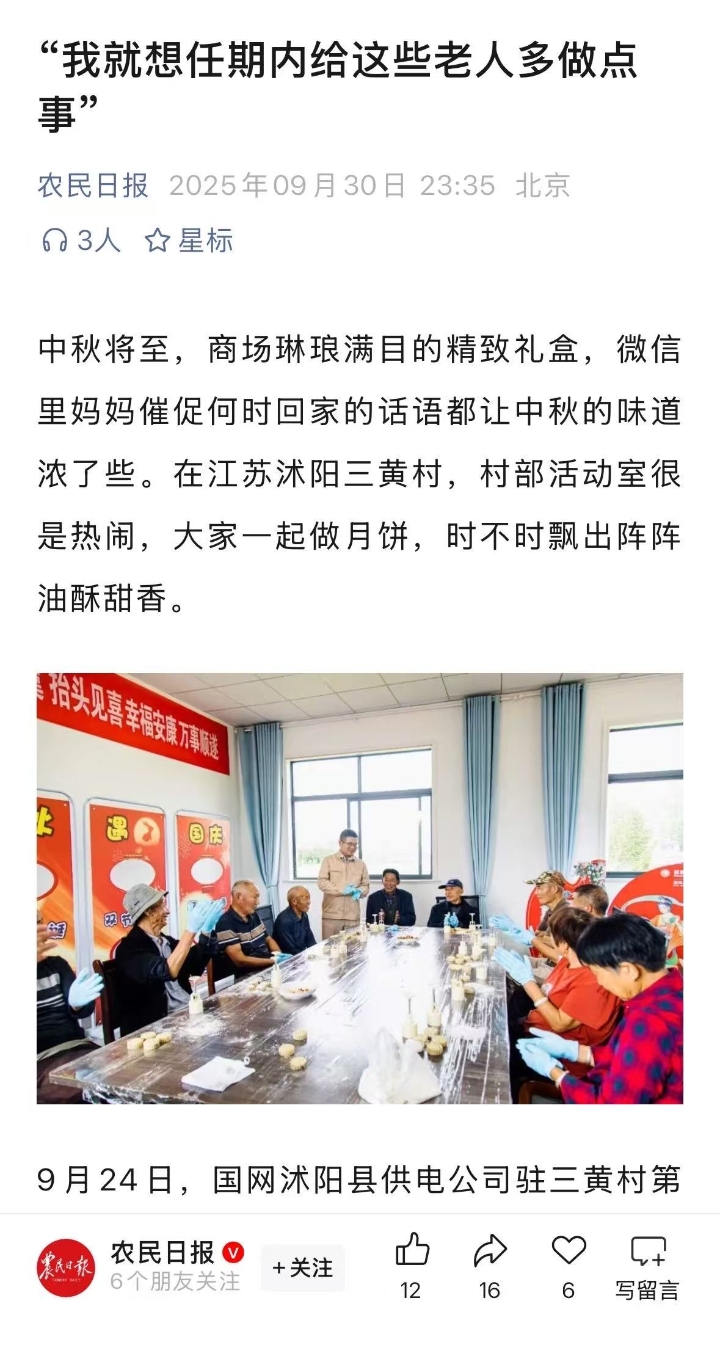 中秋将至,商场琳琅满目的精致礼盒,微信里妈妈催促何时回家的话语都让中秋的味道浓了些。在江苏沭阳三黄村,村部活动室很是热闹,大家一起做月饼,时不时飘出阵阵油酥甜香。 9月24日,国网沭阳县供电公司驻三黄村第一书记蒋鹏在日常走访中,发现除物质保障之外,村里老人最缺“热闹”、最怕“孤单”。尤其中秋佳节将至,寂寞感似乎被偷偷放大了。 “月饼外面能买到,但一起制作的快乐和温馨却买不到。”蒋鹏的想法简单而纯粹。于是,所里志愿者化身“导师”,老人们则成了好学的“学徒”,揉面、包馅、压模……这些对手脚利落的年轻人来说可能轻而易举,不过对很多老人而言却是一次全新的挑战。 初次接触,老人们手法有些生疏,但每双眼睛格外专注,蒋鹏帮张大爷把馅料稳稳地包进面皮,同时竖起大拇指夸赞徐大娘印出的玫瑰花纹清晰漂亮。 “我这双手揉过馒头、捏过包子,还是头一回做月饼,蒋书记帮我选了个机器猫的模子,说娃娃们最喜欢,要是今年我那小孙女能回来,我就给她留着。”83岁的黄玉高老人说。 “老有所依从来不只是物质上的供养,更是精神上的依靠与陪伴,现在村里很多老人的家里平时太安静了,桌子上可能就一副碗筷,电视机开着也就是听个响,我就想任期内给这些老人多做点事。”蒋鹏表示。