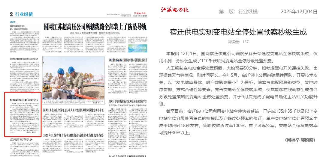 本报讯 12月1日,国网宿迁供电公司调度员徐升荣通过变电站全停快转系统,仅用不到一分钟便生成了110千伏临河变电站全停分级处置预案。 人工编制变电站全停处置预案,大约需要50分钟,如考虑配电开关遥控失败、出现极端天气等情况,则时间更长。今年5月,宿迁供电公司组建柔性团队,开展技术攻关,以“复电效率最优、时户数影响最小”为目标,统筹考虑配网联络类型、复电时序安排、方式合理性等要素,完善变电站全停快转系统,使其能够在线动态生成包含分级处置策略的变电站全停处置预案,并于9月底完成了配电自动化主站相关功能升级。 截至目前,宿迁供电公司利用变电站全停快转系统,已完成155座35千伏及以上变电站全停分级处置策略的校核以及迎峰度冬预案的修订,单座变电站全停处置预案生成平均用时18秒左右,策略校核通过率100%。有了可靠预案,变电站全停复电效率可提升30%以上。 稿件来源:江苏电力报 一审一校:郭盼盼 二审二校:孟飞 三审三校:吕海侠