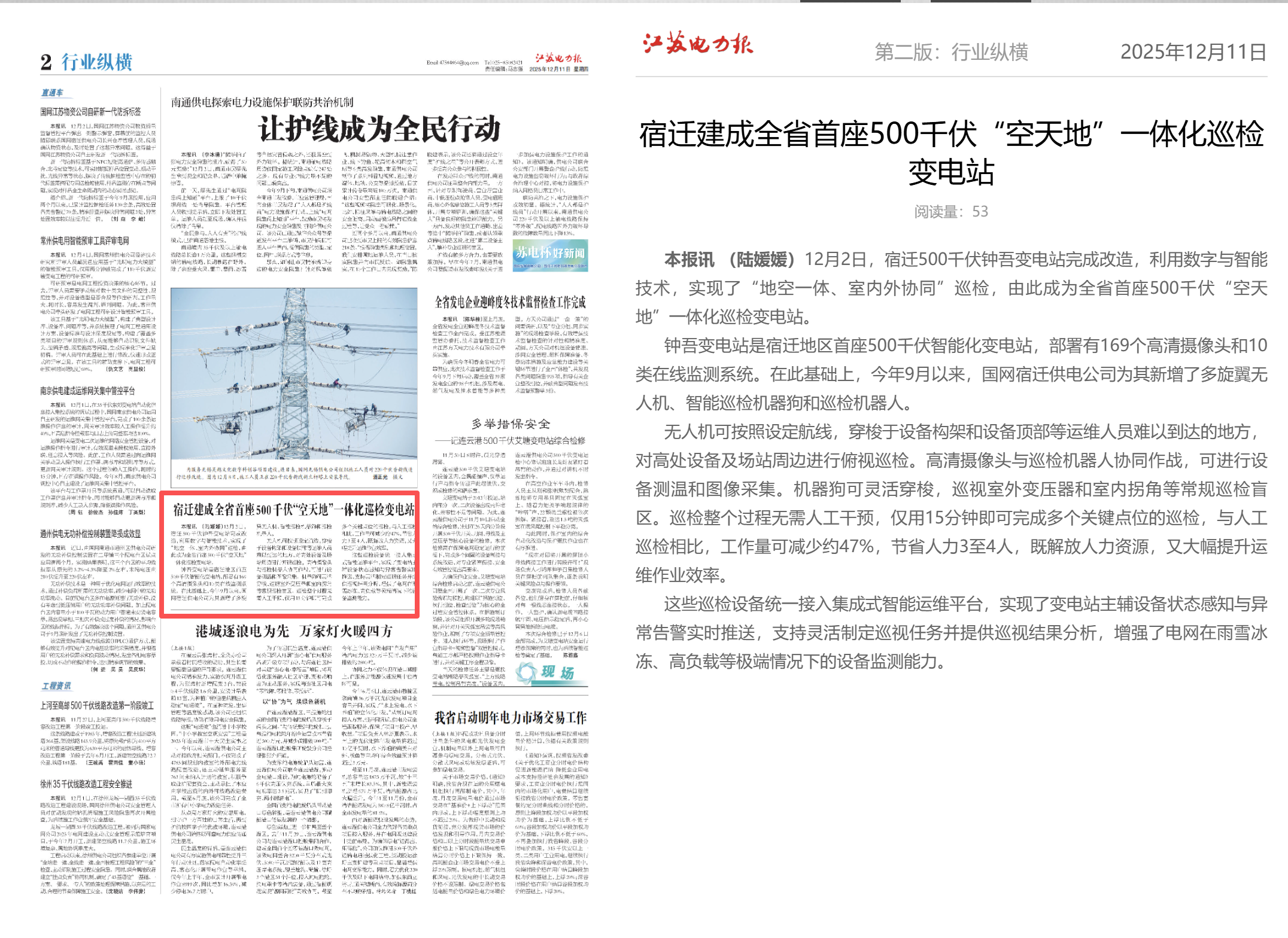本报讯 (陆媛媛)12月2日,宿迁500千伏钟吾变电站完成改造,利用数字与智能技术,实现了“地空一体、室内外协同”巡检,由此成为全省首座500千伏“空天地”一体化巡检变电站。 钟吾变电站是宿迁地区首座500千伏智能化变电站,部署有169个高清摄像头和10类在线监测系统。在此基础上,今年9月以来,国网宿迁供电公司为其新增了多旋翼无人机、智能巡检机器狗和巡检机器人。 无人机可按照设定航线,穿梭于设备构架和设备顶部等运维人员难以到达的地方,对高处设备及场站周边进行俯视巡检。高清摄像头与巡检机器人协同作战,可进行设备测温和图像采集。机器狗可灵活穿梭,巡视室外变压器和室内拐角等常规巡检盲区。巡检整个过程无需人工干预,仅用15分钟即可完成多个关键点位的巡检,与人工巡检相比,工作量可减少约47%,节省人力3至4人,既解放人力资源,又大幅提升运维作业效率。 这些巡检设备统一接入集成式智能运维平台,实现了变电站主辅设备状态感知与异常告警实时推送,支持灵活制定巡视任务并提供巡视结果分析,增强了电网在雨雪冰冻、高负载等极端情况下的设备监测能力。 稿件来源:江苏电力报 一审一校:陆媛媛 二审二校:孟飞 三审三校:吕海侠
