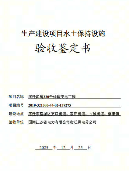宿迁闻涛220千伏输变电工程 水土保持设施验收鉴定书