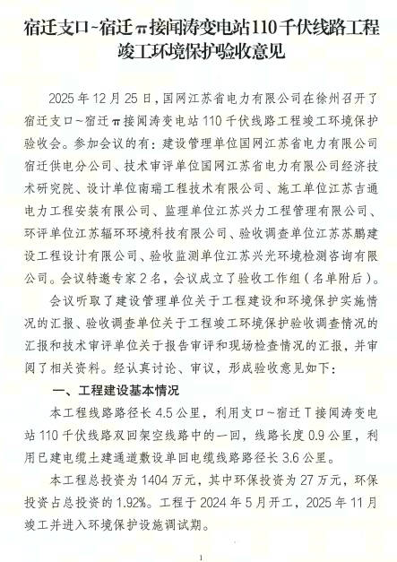 宿迁支口~宿迁π接闻涛变电站110kV线路工程环保验收意见