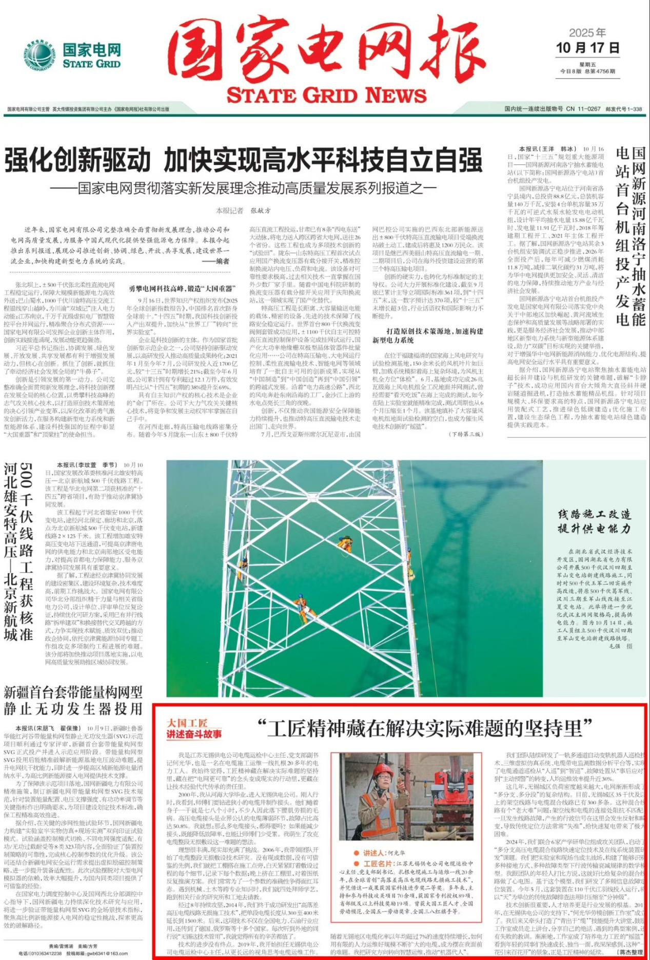 10月17日《国家电网报》头版大国工匠讲述奋斗故事专栏刊发《“工匠精神藏在解决实际难题的坚持里”》