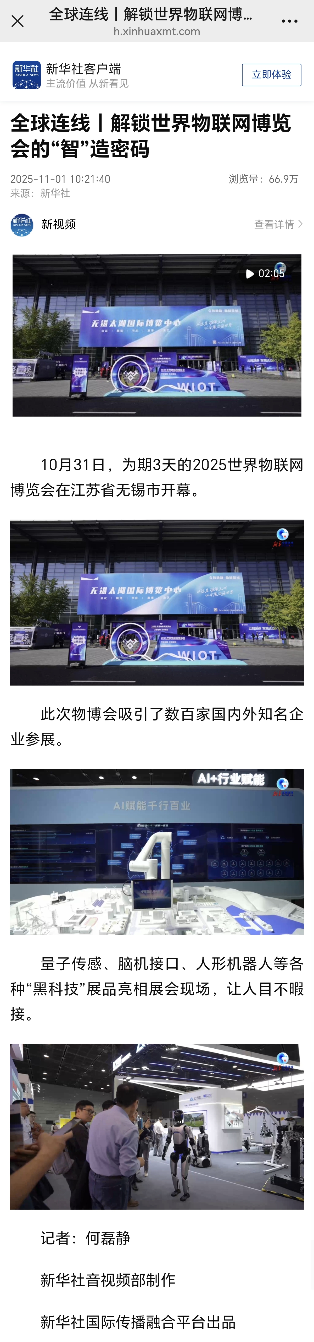 11月1日 新华社刊发视频通稿《全球连线|解锁世界物联网博览会的“智”造密码》