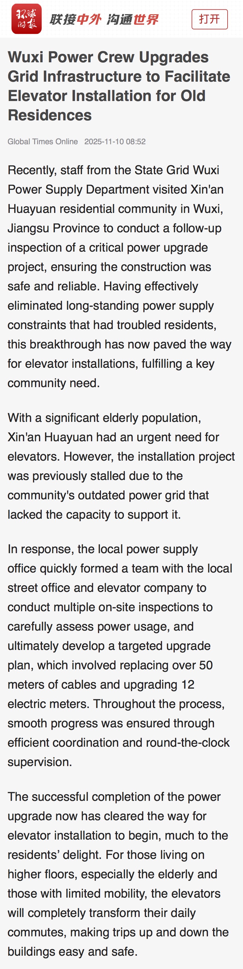11月10日 环球网刊发英文通稿《Wuxi Power Crew Upgrades Grid Infrastructure to Facilitate